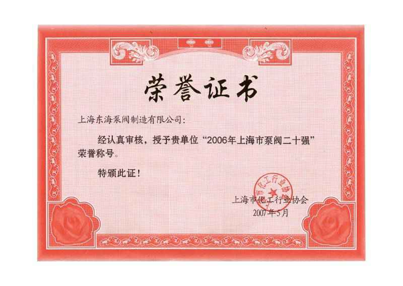 认证,2006年荣获上海市泵阀二十强企业。